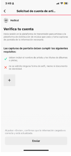 Deberás subir capturas de pantalla (screenshots) de Spotify for Artists o de tu distribuidora, donde se muestre tu nombre de artista y tus lanzamientos. Esto es necesario para confirmar que verdaderamente eres tú ese artista. Finalmente, haz clic en "Enviar".