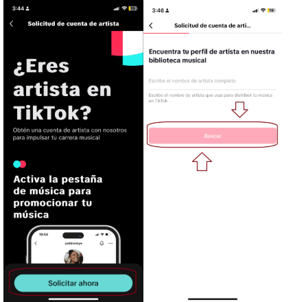 Una vez dentro, haz clic en "Solicitar ahora". Luego, escribe tu nombre de artista y presiona "Buscar".