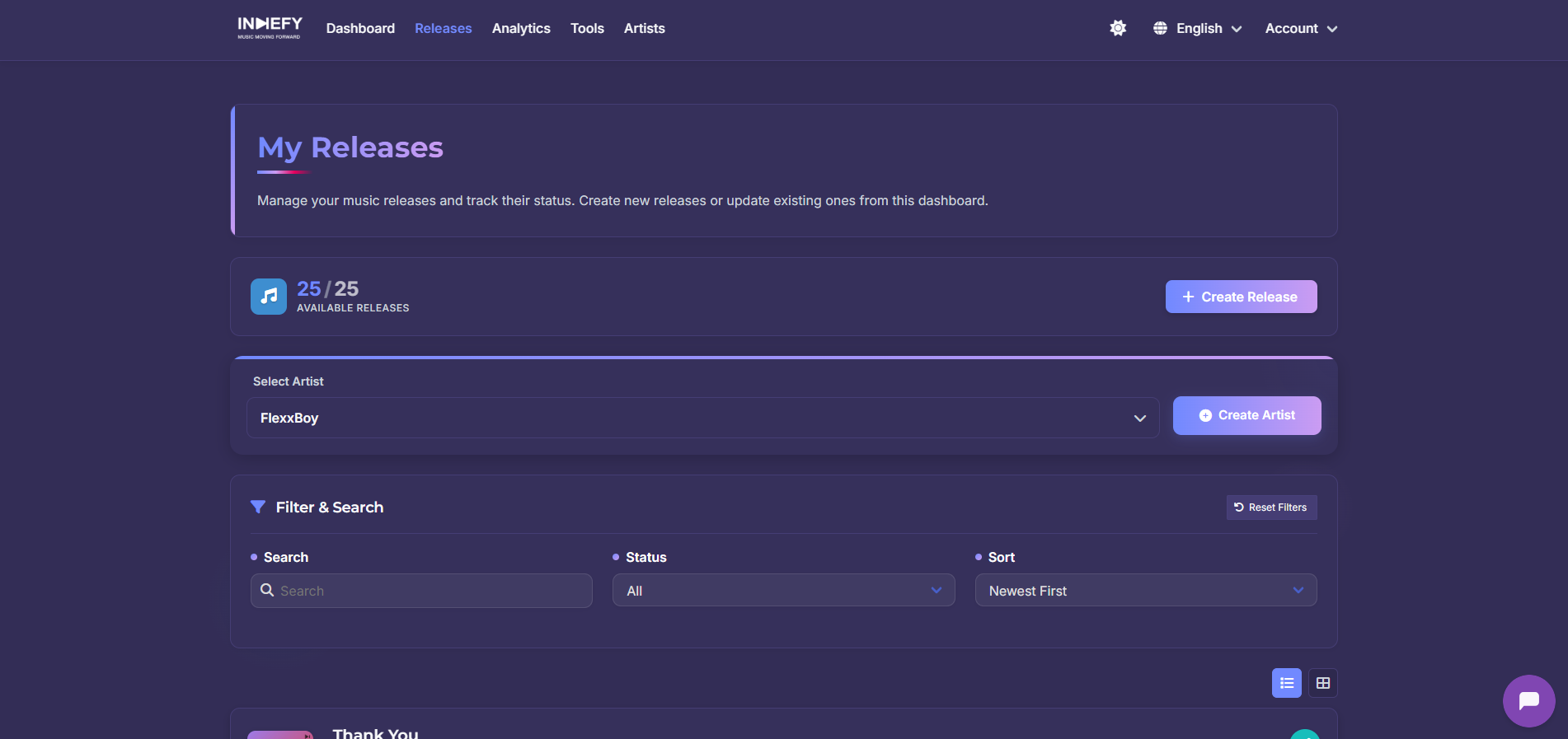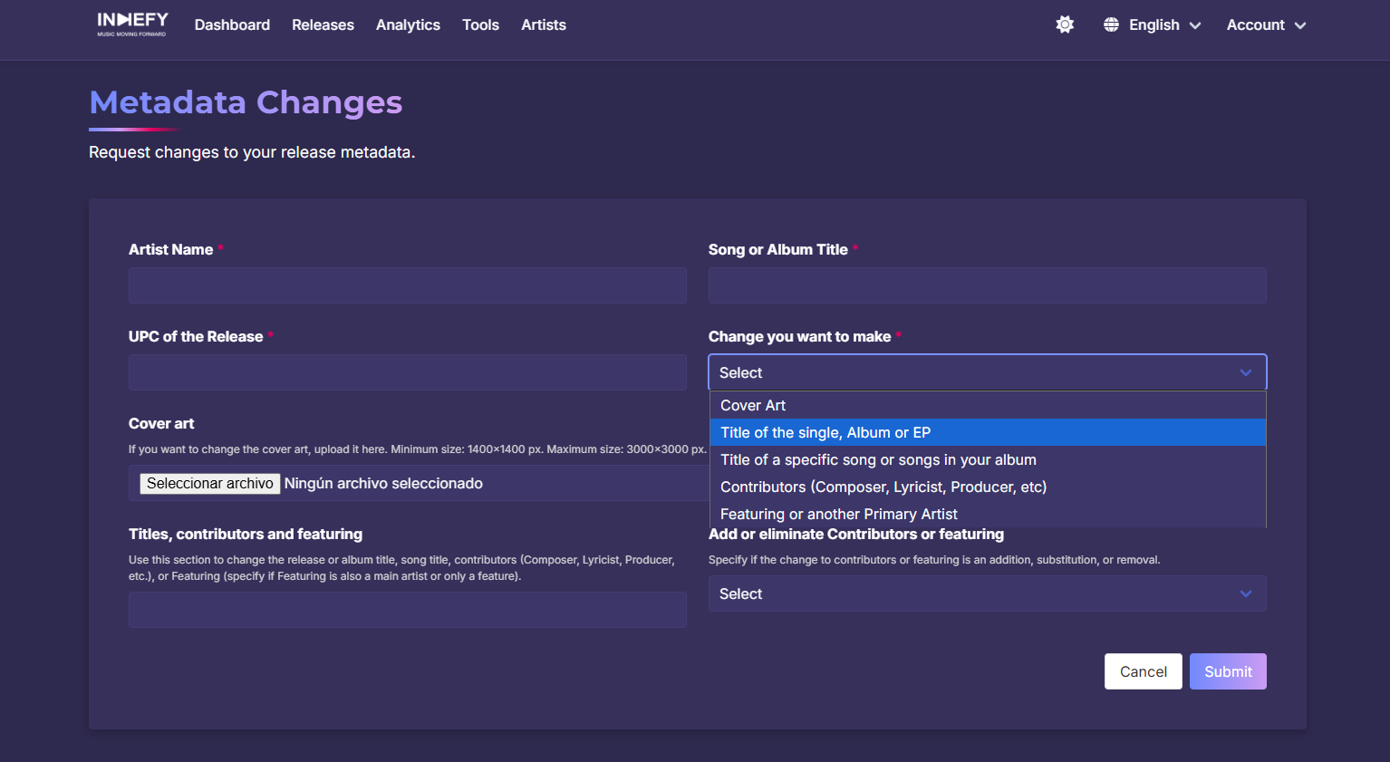 We know that mistakes can happen from time to time, and sometimes you just need to make a few changes. With this feature, you can edit in real time. There’s no need to delete and re-upload your release — simply request the change through the Metadata Change Form located at indiefy.net/tools