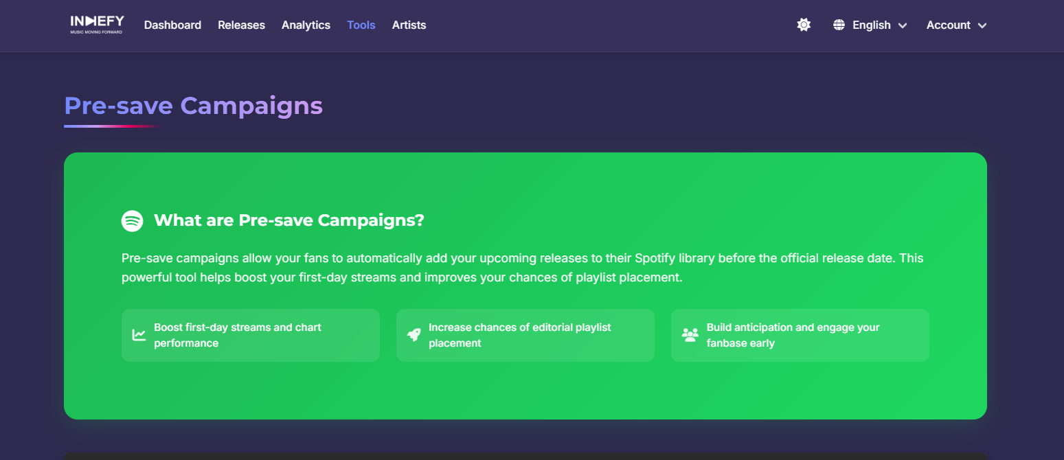 As a PRO user, you have access to an exclusive tool that generates a pre-save link, which you can share for people to save your release before it’s published. This way, once your song is available, those who pre-saved it will automatically have your release in their "liked" list, ensuring they don’t miss it and increasing visibility from day one.