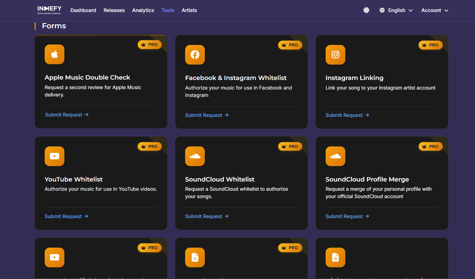 Indiefy offers exclusive support services for PRO users, assisting with key features like being added to YouTube, Instagram, or SoundCloud whitelists. These services are designed to provide better support and increase your music’s visibility on popular platforms. We also offer specific forms that allow you to link your Instagram profile to your music or request an official YouTube channel, helping you manage your digital presence more effectively
