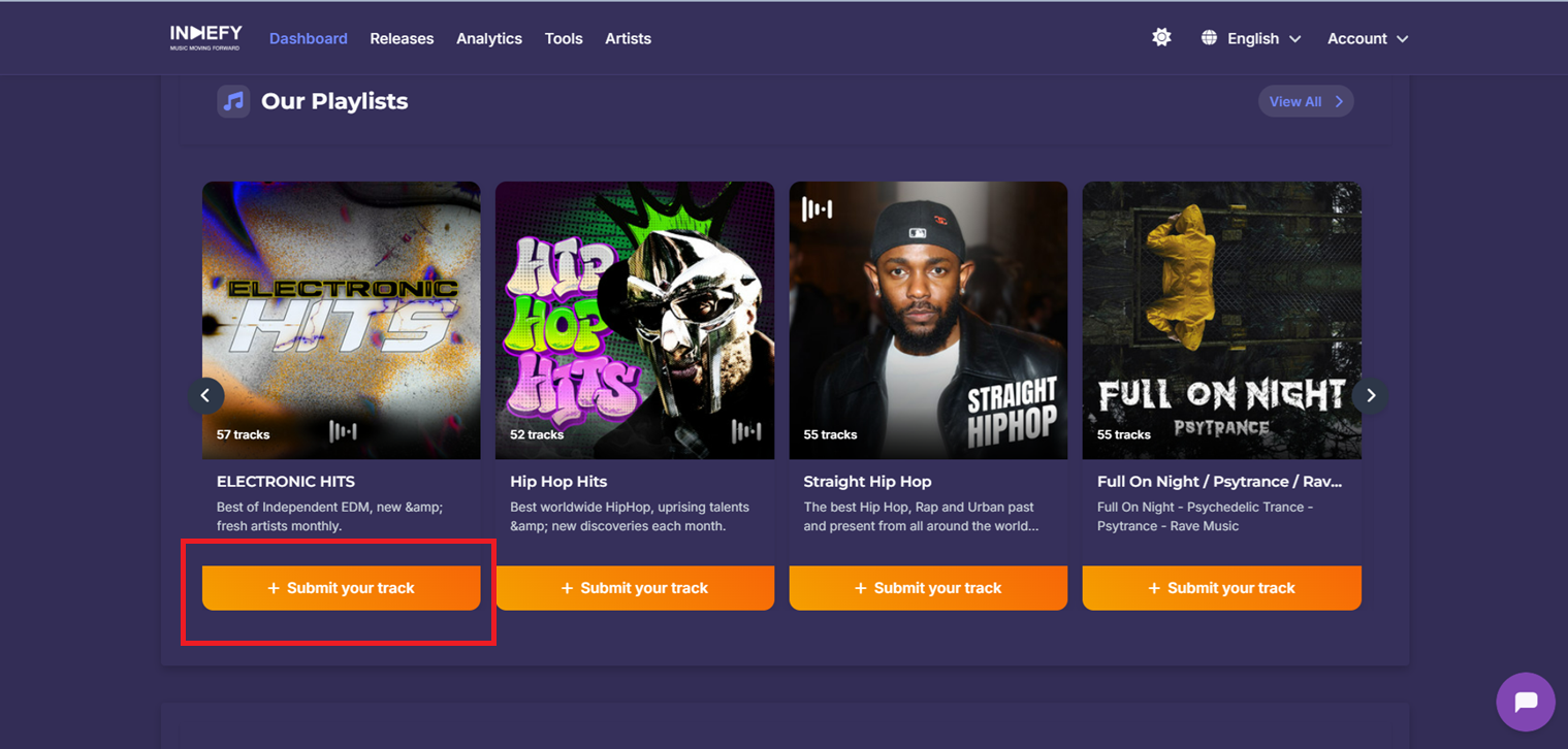 Inside your main dashboard, you’ll find the “Our Playlists” section. There, you can explore different lists by genre and musical style. Review them carefully and choose the Playlist that best fits the style and energy of your song.