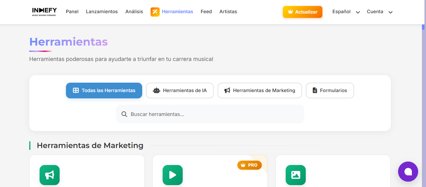 En Indiefy contamos con una herramienta de marketing diseñada para ayudarte a promocionar tu música, ya sea en redes sociales o mediante playlists. Con nuestro servicio, curadores de playlists podrán revisar tu música y decidir si incluirla, aumentando así tu visibilidad y el número de personas que te escuchan.