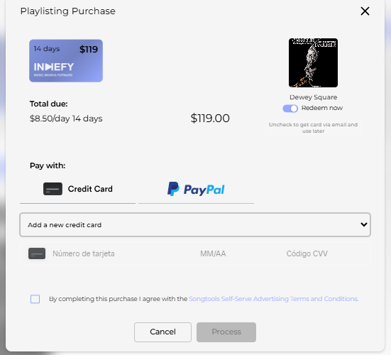 Verás los precios disponibles según el tipo de promoción: anuncios en redes sociales o aplicación a playlists.