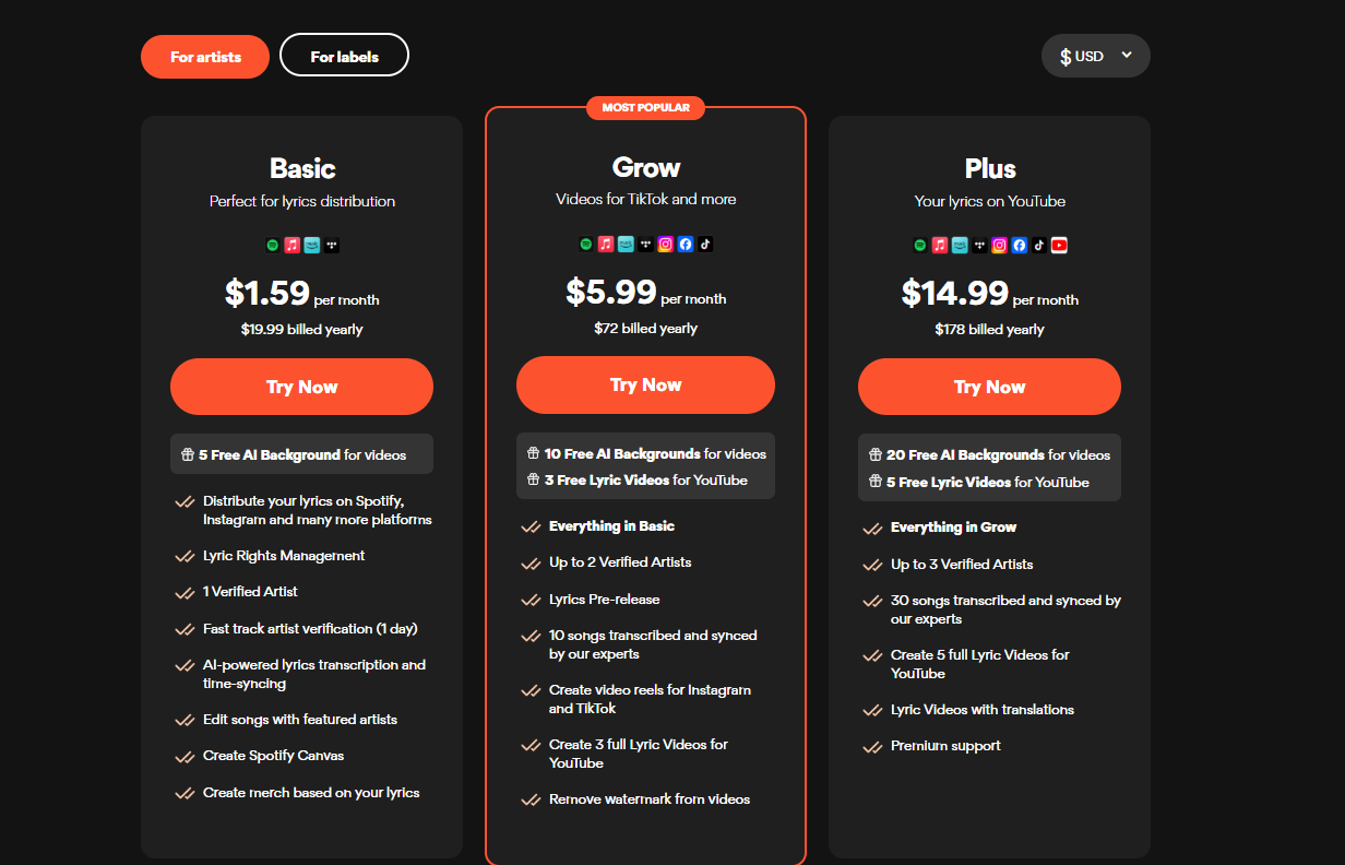 Before you verify your artist account, Musixmatch may suggest one of its memberships based on the artist's needs. You can choose from 4 paid plans that offer various benefits depending on the plan, but you can continue with the free option if your only goal is to sync your lyrics across platforms.